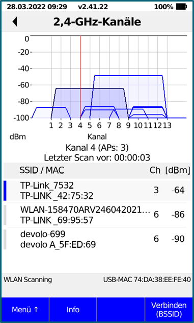 Manual selection and analysis of the Wi-Fi channels either in tabular or graphical format
